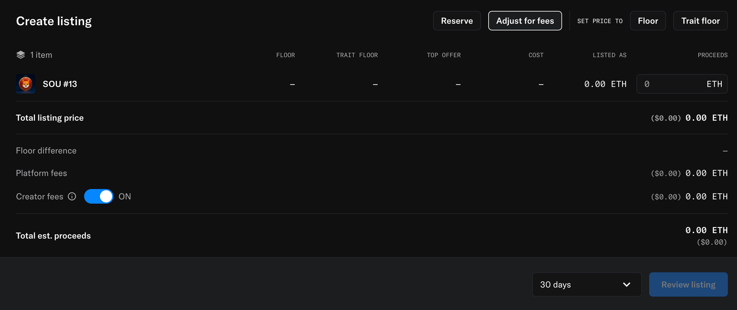 Enter the Total listing price in ETH. You can also quickly set the price to the Floor or Trait floor.